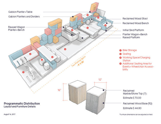 The community will partake in the building process by engaging with local craftsmen and contractors to decide what artifacts will be placed into the gabions in addition to the provided base of recycled, crushed concrete, hay, and bricks. This method will allow for the parks budget to be flexible and encourage creative minds to work together in curating the details. Used concrete, bricks, and hay symbolize the essence of manufacturing and agriculture as a romantic past while the vegetation and additional objects are sprouting the new interactions and conversations that will form along the NAMAzing Parklet.